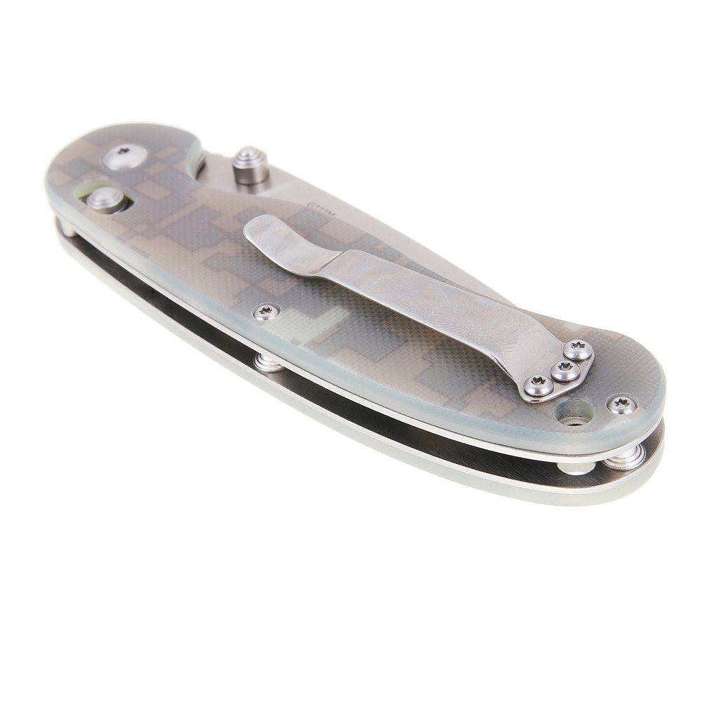 Rukojeť nože je osazena střenkami z odolného kompozitního materiálu G10, který vyniká vysokou pevností, odolností proti opotřebení a rezistencí vůči chemickým látkám. Texturovaný povrch poskytuje jistý a bezpečný úchop za všech podmínek. K dispozici je několik barevných variant rukojeti – černá, oranžová, zelená (swamp green) a camouflage. Praktický kapesní klip umožňuje pohodlné nošení nože na opasku či v kapse, nechybí ani otvor pro provlečení pojistné šňůrky.