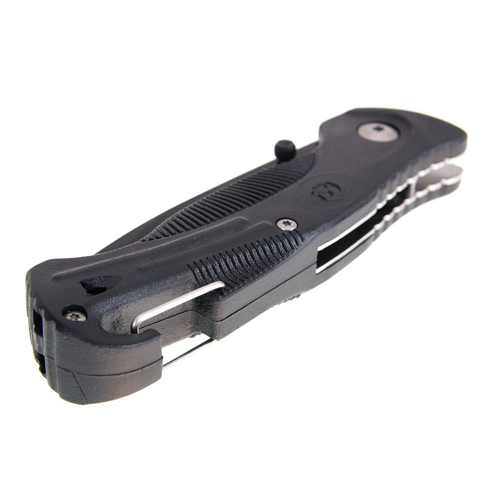 Ergonomicky tvarovaná rukojeť z odolného černého plastu perfektně padne do ruky a zajišťuje bezpečný úchop. Tento model se odlišuje integrovanou píšťalkou v rukojeti, která může být v krizových či nouzových situacích neocenitelným pomocníkem. Praktickým doplňkem je také karabina, díky níž lze nůž snadno připnout k opasku, batohu nebo výstroji a mít jej vždy po ruce.
