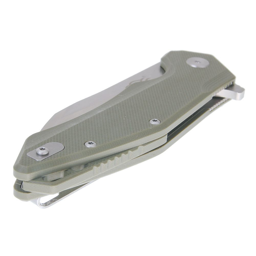 Rukojeť je vyrobena z odolného kompozitního materiálu G10, který je pevnější než běžný plast, odolný proti slunečnímu záření, vodě a mechanickému namáhání. Ergonomický tvar a texturovaný povrch zajišťují bezpečný a pohodlný úchop i při dlouhodobém používání. Na konci rukojeti jsou otvory pro připevnění šňůrky a kovová klipsa, kterou lze v případě potřeby přesunout.