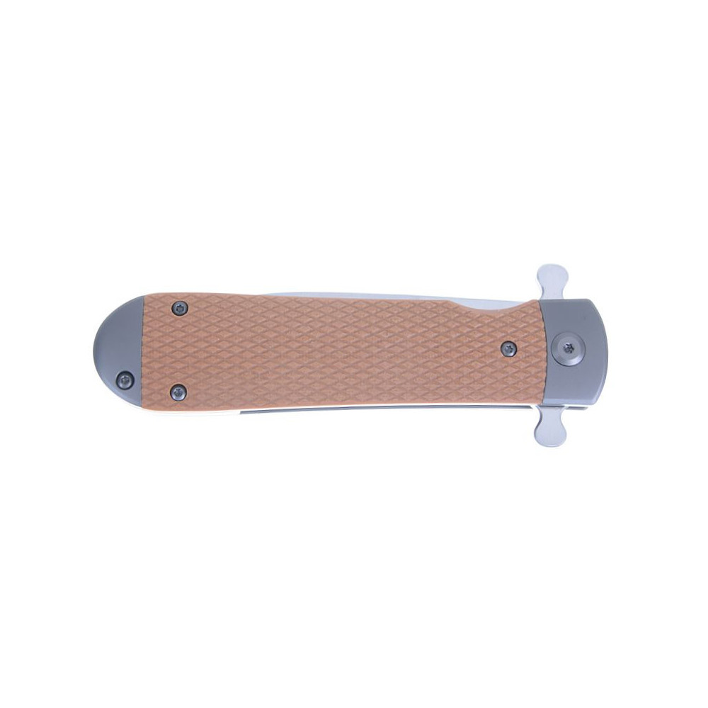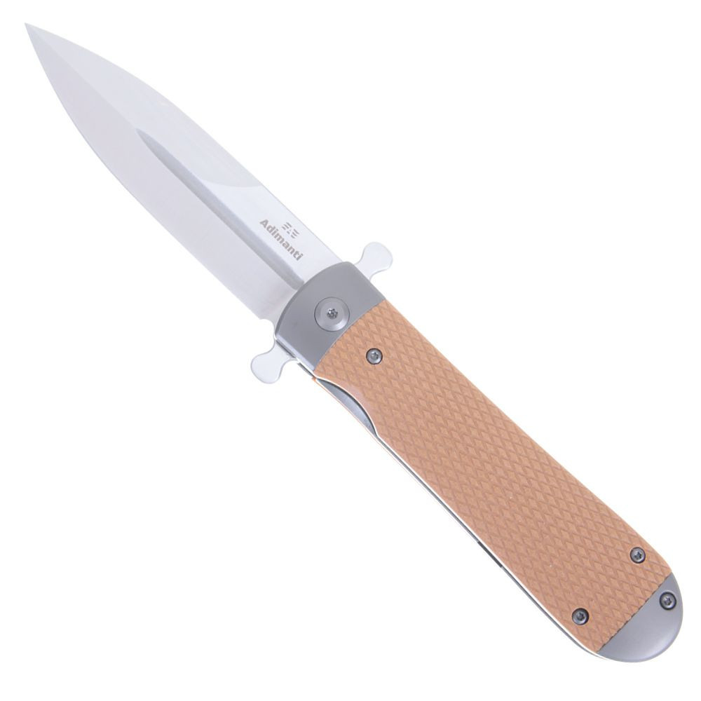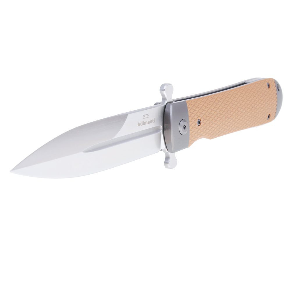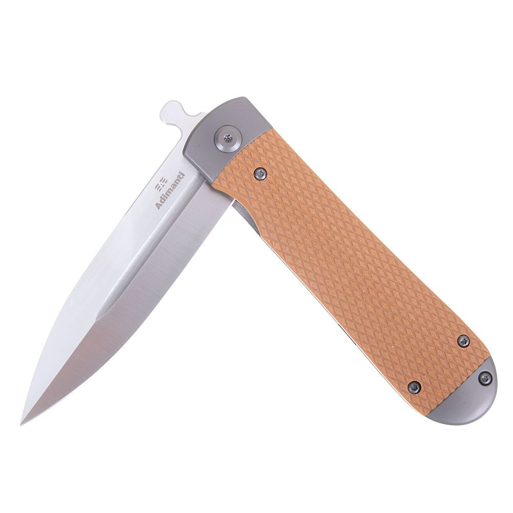 Adimanti Samson je kompaktní Flipper, jehož čepel je bezpečně zajištěna v otevřené i zavřené poloze. Rukojeť má pevný ocelový rám doplněný o dvě texturované střenky z materiálu G10. Tento odolný kompozit vyniká vysokou pevností, odolností vůči nárazům, mrazu i UV záření, neklouže v dlani a dlouhodobě si zachovává svůj vzhled.