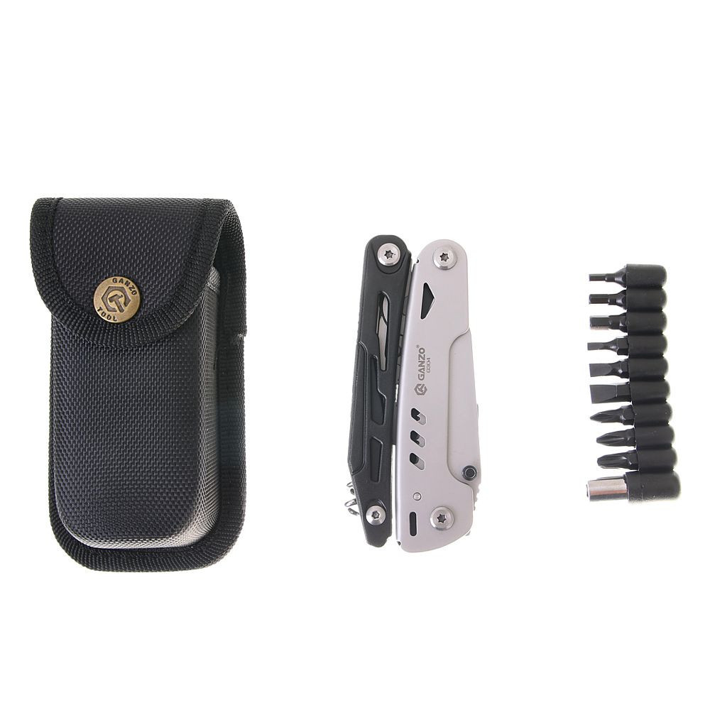 Funkčnost Ganzo G304 rozšiřuje 9 výměnných bitů, které jsou součástí sady spolu s držákem. Chcete-li z multitoolu udělat šroubovák, musíte na něj upevnit držák s hrotem ve tvaru kříže a poté - do držáku vložit potřebný bit.