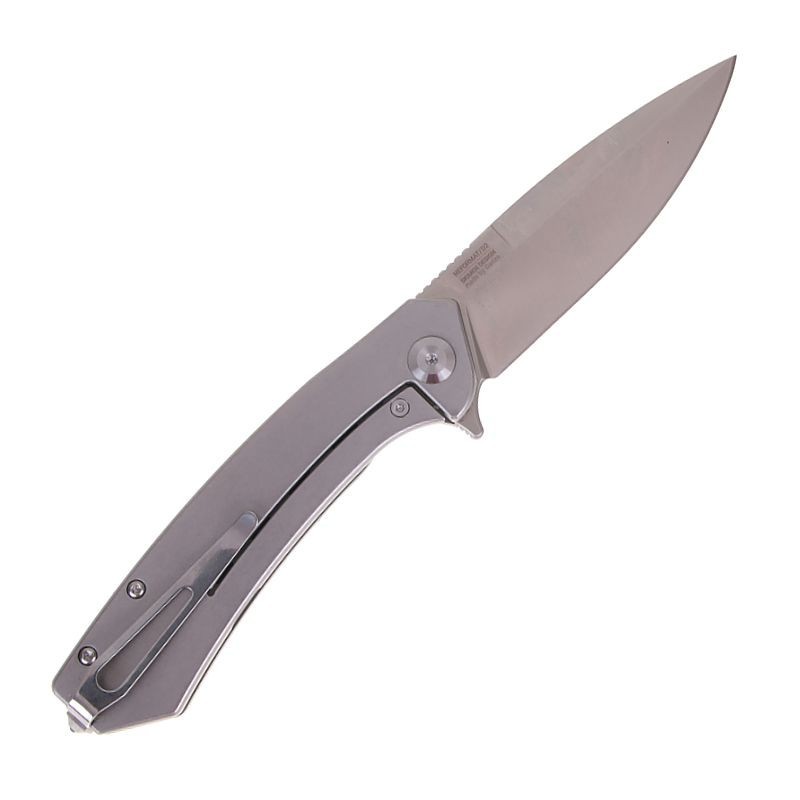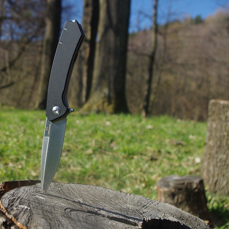 Sercem noża jest wytrzymała stal narzędziowa D2, charakteryzująca się długą żywotnością ostrza, wysoką twardością i odpornością na zużycie. Twardość klingi wynosi około 60 HRC, co gwarantuje doskonałe właściwości tnące. Głownia ma gładkie ostrze, długość 85 mm i grubość 3,5 mm. Otwieranie jest szybkie i wygodne dzięki flipperowi, a blokada Frame-Lock skutecznie zapobiega przypadkowemu zamknięciu lub otwarciu noża.